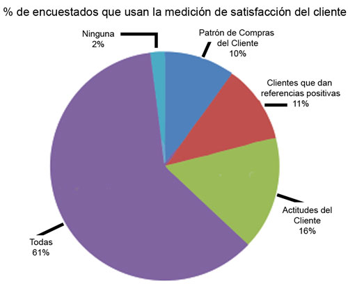 De los participantes que respondieron, el 10 % señaló que miden la satisfacción del cliente mediante el análisis de los patrones de compra de los clientes, mientras que el 11 % indicó que miden la satisfacción en función de si, y cuántos, los clientes dan referencias. 16 % de los participantes dijo que miden las actitudes de los clientes, mientras que una mayoría significativa de los encuestados indicaron que ellos usan estos tres métodos para medir la satisfacción del cliente.