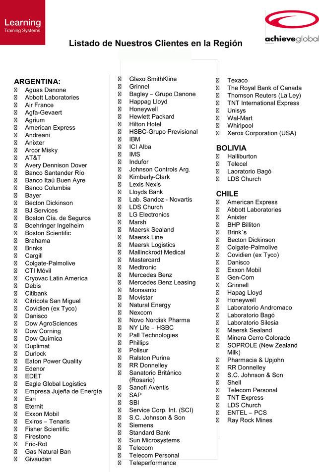 En AchieveGlobal estamos orgullosos de nuestra lista de clientes satisfechos, la cual aumentamos constantemente desde 1995. Las organizaciones mencionadas abajo, son organizaciones de nuestra Región exclusiva. Muchas de ellas son las empresas más representativas y exitosas en sus mercados. Nos sentimos honrados de que nos hayan permitido mejorar la performance de sus activos más valiosos: sus empleados.