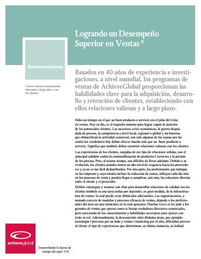 Si usted está buscando un programa de desarrollo de la fuerza de ventas que ofrezca flexibilidad, expertise y posibilidad de customización (uno que sea ofrecido por un proveedor líder, reconocido en este campo) vea lo que ArchieveGlobal tiene para ofrecerle. Descargue el brochure sobre Desempeño Superior en Ventas en la columna de la derecha y póngase en contacto con nosotros. Siempre estamos dispuestos a ayudarle a determinar la mejor opción de desarrollo, para las necesidades de su organización.